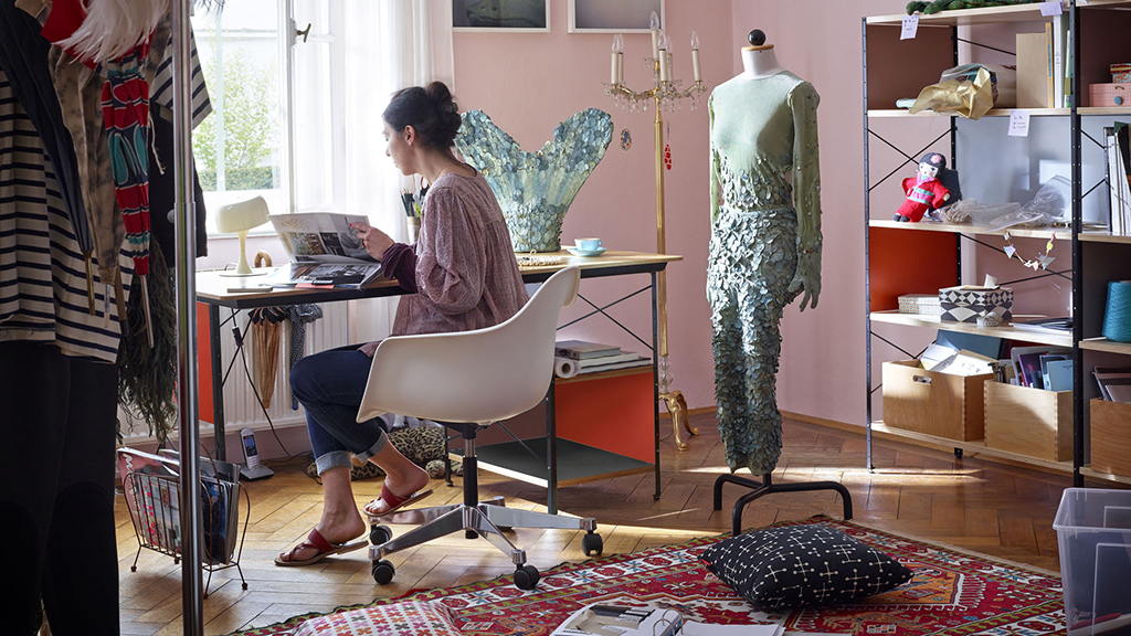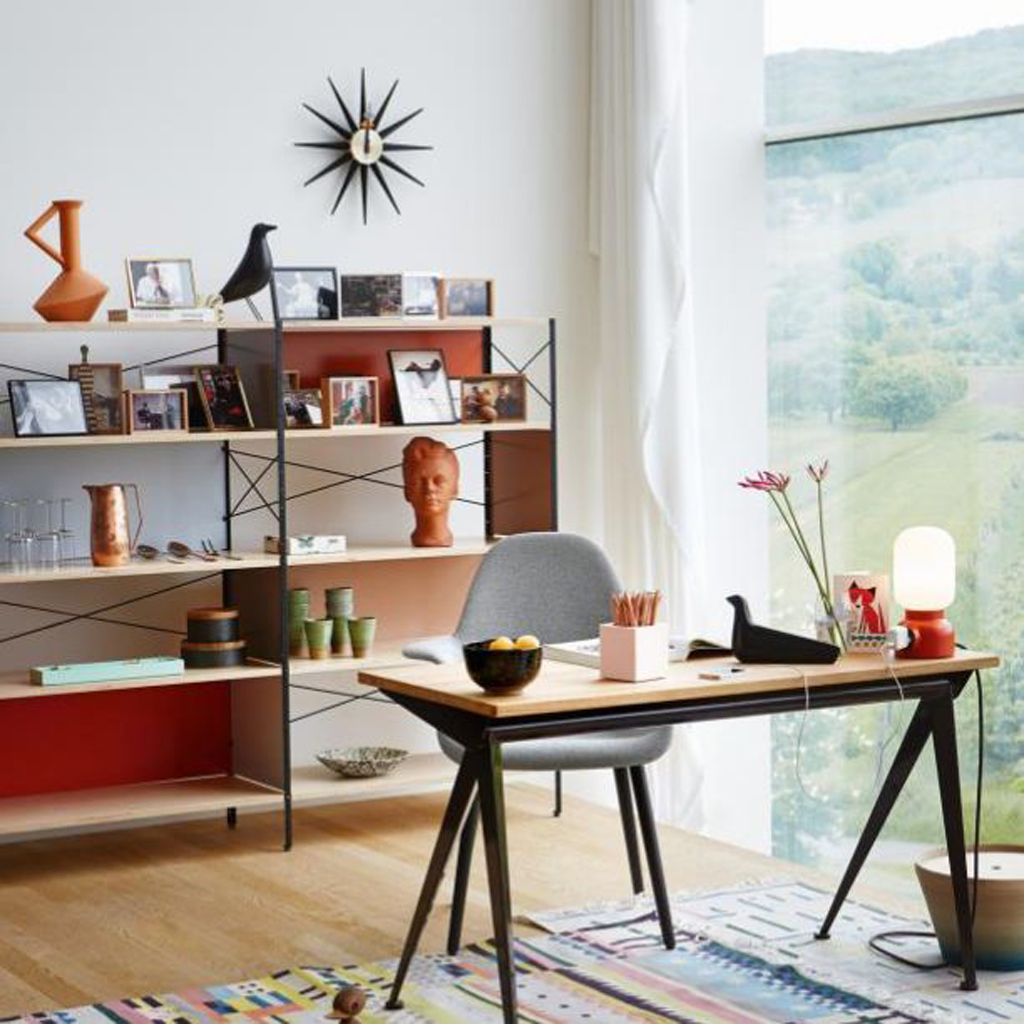 Стеллаж Eames Storage Unit Shelf от дизайнеров Charles & Ray Eames производится с 1949 г. В послевоенные годы дизайнеры выступили с идеей "оторвать" стеллаж от стены и установить его в центре комнаты в роли зонирующей пространство перегородки. Это было инновационным решением для тех лет. Каркас из гальванизированного металла с шероховатой поверхностью, боковины и задние панели лакированы яркими цветами.