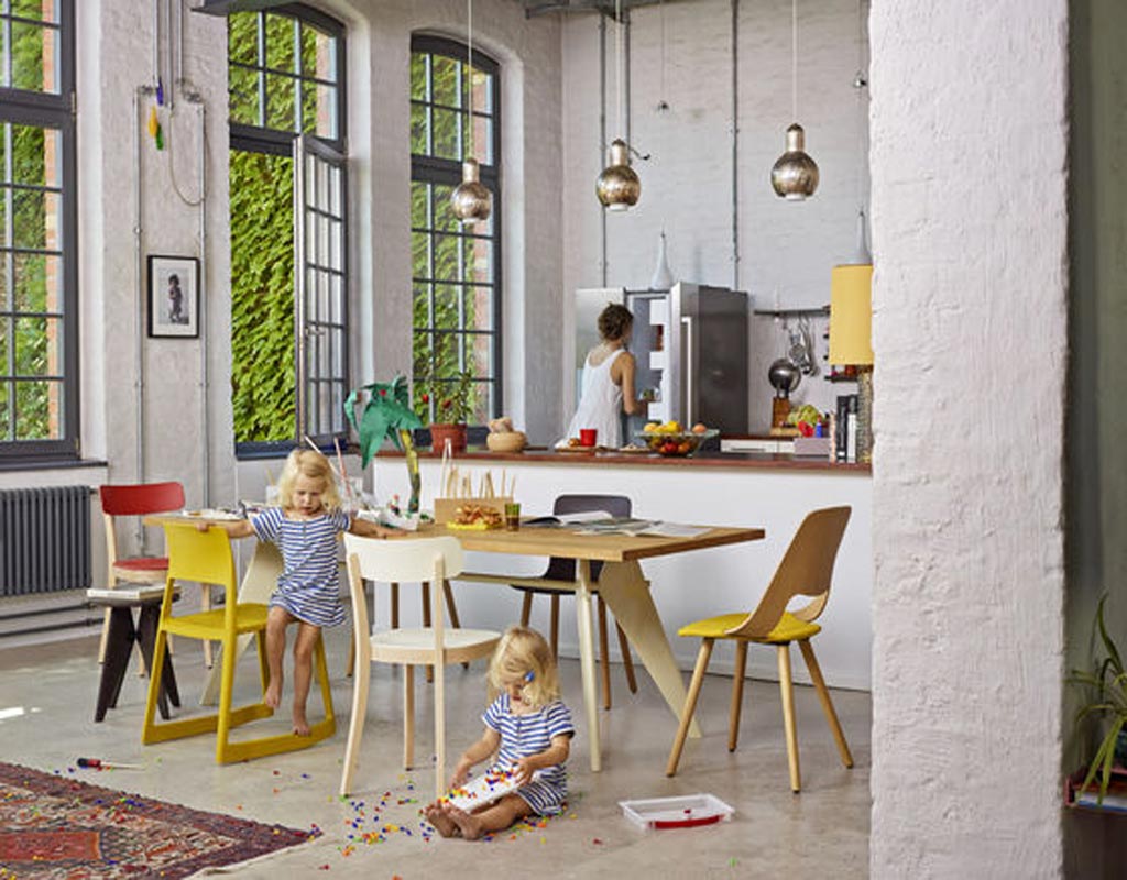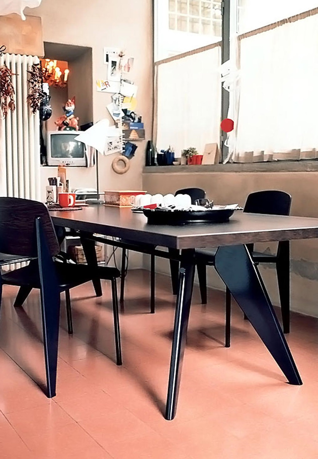 Стол EM Table от дизайнера Jean Prouve производится с 1950 г. Модель была создана для проекта сборных домов "Maison Tropique". Каркас из стальных листов, окрашенных порошковым способом, столешница из шпона натурального дуба. Эта разновидность шпона выглядит как-будто лакированная, на самом деле это является оптическим обманом. В настоящее время для заказа доступны столешницы из массива или ламината пяти различных размеров от 180 до 260 мм.