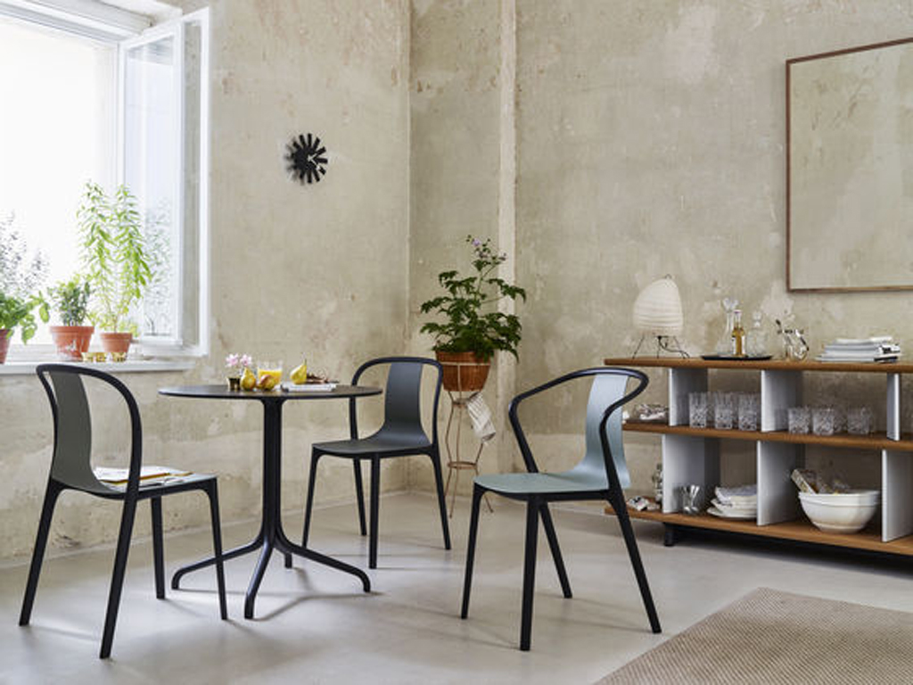 Кресло Belleville Armchair от дизайнеров Ronan & Erwan Bouroullec производится с 2015 г. Модель представляет собой технически сложный стул, состоящий из двух компонентов - структурного каркаса и сиденья. Каркас из полиамида черного цвета поддерживает тонкое сиденье, сужающееся от широкой поверхности сидения к узкой спинке.