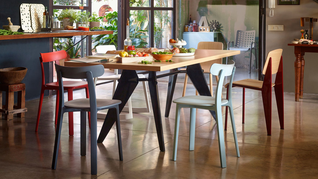 Стол EM Table от дизайнера Jean Prouve производится с 1950 г. Модель была создана для проекта сборных домов "Maison Tropique". Каркас из стальных листов, окрашенных порошковым способом, столешница из шпона натурального дуба. Эта разновидность шпона выглядит как-будто лакированная, на самом деле это является оптическим обманом. В настоящее время для заказа доступны столешницы из массива или ламината пяти различных размеров от 180 до 260 мм.